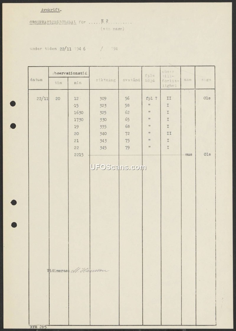 This document is an observation log (Observationsjournal) from station E 2, dated November 22, 1946. The log records a series of observations made between 20:12 and 22:15. The entries track specific times, directions (ranging from 309 to 345), and distances (ranging from 56 to 79). The column for altitude is consistently marked with 'fpl ?', which translates to 'aircraft?'. The reliability of the observations is categorized as either 'I' or 'II'. The document is signed by M. Hansson. The log provides a structured record of aerial tracking data, though it lacks descriptive details regarding the nature or appearance of the objects observed beyond the implied question of whether they were aircraft.