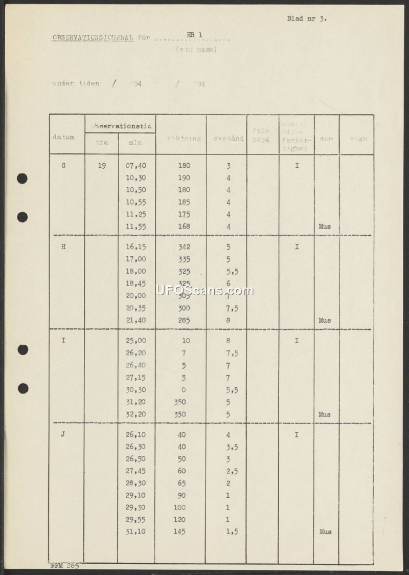 This document, labeled 'Blad nr 3' (Sheet No. 3) and identified as 'OBSERVATIONSJOURNAL' (Observation Journal) for 'ER 1', provides a tabular record of aerial observations. The journal is organized into four distinct observation sets, designated by the letters G, H, I, and J. Each entry tracks the time of observation, the direction of the object, and the distance. The column for 'fpls hojd' (aircraft altitude) remains blank throughout the document. A column for 'obs tillforlitlighet' (observation reliability) is marked with the letter 'I' for the initial entry of each sequence. Each sequence concludes with the notation 'Mus' at the final time entry. The document provides no narrative context, dates, or specific geographic locations, serving strictly as a technical log of tracking data.