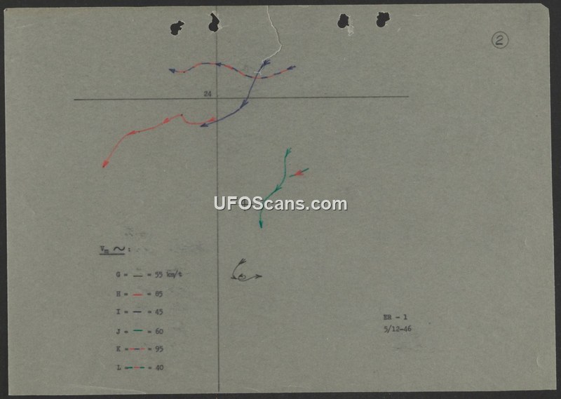 This document, dated May 12, 1946, and labeled ER-1, consists of a graphical analysis of flight paths. The page features a hand-drawn coordinate grid with several colored lines representing distinct trajectories. A legend is provided for the variable 'Vm', which lists six categories (G, H, I, J, K, L) corresponding to specific numerical values, likely representing velocity in km/t (kilometers per time unit). The values provided are 55, 85, 45, 60, 95, and 40. The document serves as a technical record of movement patterns without providing narrative context or descriptive information regarding the nature of the objects being tracked.