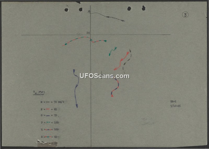 This document, dated December 5, 1946, and labeled ER-1, consists of a graphical analysis of seven distinct flight paths. The chart displays various curvilinear trajectories plotted on a grid, with each path represented by a specific color and line style. A legend on the left side of the document correlates these paths to specific velocity measurements, denoted as Vm. The recorded speeds are 70 km/t, 85, 70, 120, 100, 60, and 60. The document provides no narrative context, identifying information for the objects tracked, or the location of the observation.
