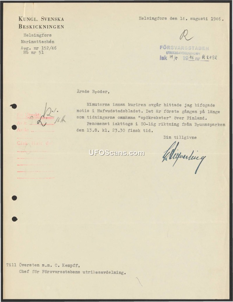 A 1946 letter from the Swedish Naval Attaché in Helsinki to the Swedish Defence Staff reporting on a newspaper account of 'ghost rockets' observed over Finland on August 13, 1946.