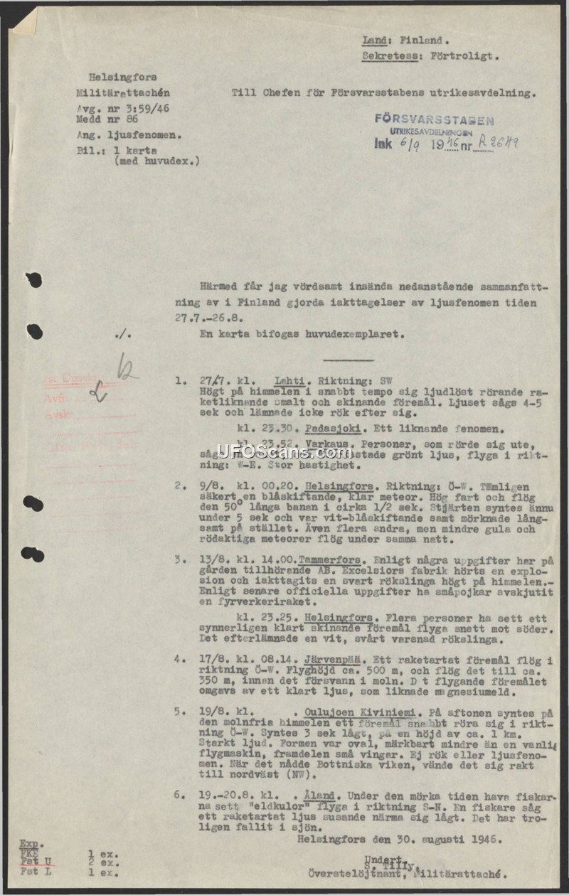 A 1946 military report from the Finnish Military Attaché summarizing six sightings of unidentified aerial phenomena, including rocket-like objects and fireballs, observed across Finland.
