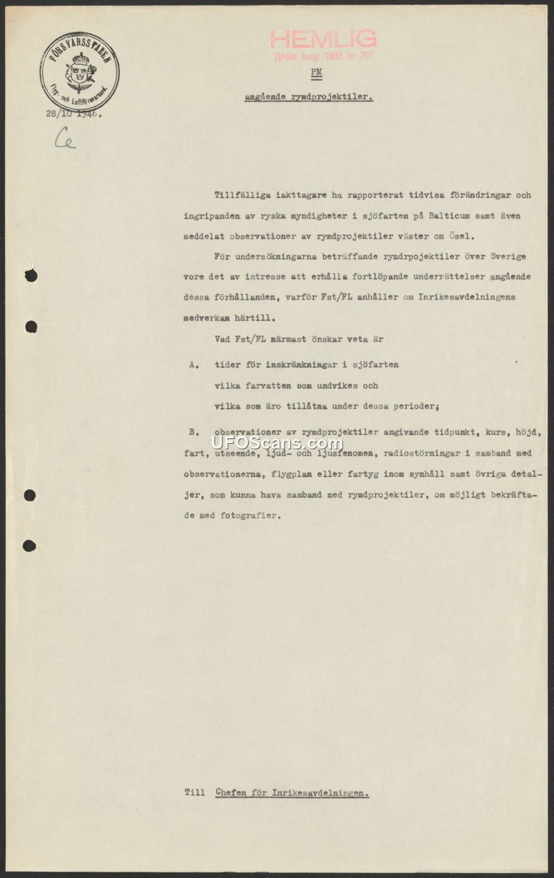 This memorandum, dated October 28, 1946, and classified as 'HEMLIG' (Secret), was issued by the Swedish Defense Staff (Fst/FL) to the Chief of the Internal Department. The document addresses reports from observers regarding changes and interventions by Russian authorities concerning shipping in the Baltic Sea, as well as sightings of 'space projectiles' (rymdprojektiler) west of the island of Ösel. To assist in their investigations into these projectiles over Sweden, the Defense Staff requests continuous intelligence from the Internal Department. Specifically, the Defense Staff seeks information regarding two main areas: first, the timing of shipping restrictions, including which waters are avoided and which are permitted; and second, detailed observations of the projectiles, including time, course, altitude, speed, appearance, sound and light phenomena, radio interference, and the presence of any aircraft or ships. The document concludes by requesting that these observations be confirmed with photographs whenever possible.