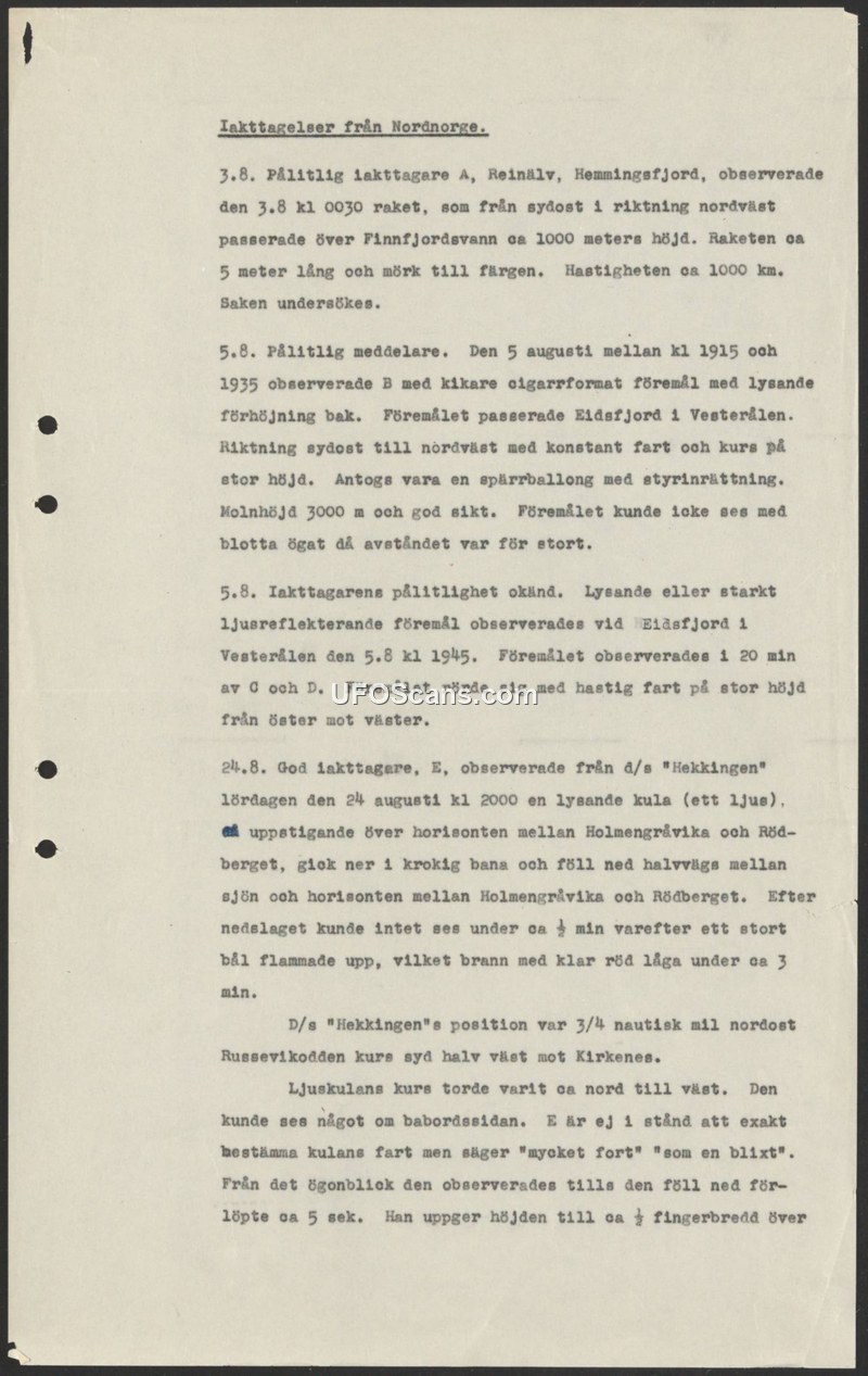 A collection of four aerial sighting reports from Northern Norway in August 1935, including rockets, cigar-shaped objects, and a glowing sphere that resulted in a fire upon impact.