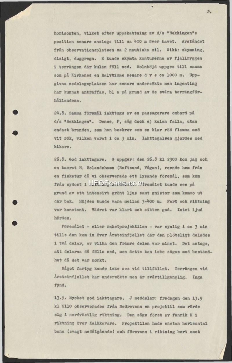 This document contains a series of reports regarding unidentified aerial phenomena observed in Norway during the late summer of 1948. The first entry describes an incident on August 24, where an object was observed near the Hekkingen area. A passenger on the d/s Hekkingen reported seeing a bright red flame with white smoke lasting approximately three minutes, though they did not witness the object fall. Subsequent searches of the area were unsuccessful due to the challenging terrain. A second, more detailed report from August 26 involves a witness identified as G, who, while returning from a fishing trip with a companion, observed a luminous object traveling from the southeast to the northwest. The object was described as emitting an intense green light and sparks from its rear. It maintained a constant speed and direction at an altitude estimated between 300 and 400 meters. The object, referred to as a rocket projectile, remained visible for about three minutes before passing over Årsteinfjellet, where it suddenly split into two parts, with the front section being smaller. It was assumed the parts fell to the ground, but this could not be confirmed due to darkness. No ships were observed in the vicinity, and subsequent searches of the Årsteinfjellet terrain yielded no findings. A final report from September 13 describes an observation by a witness identified as J, who reported a projectile moving in a northwesterly direction at 2110 hours. The object was first spotted by an Ensign K over Kalkkavare, following a nearly horizontal, slightly descending path before disappearing.