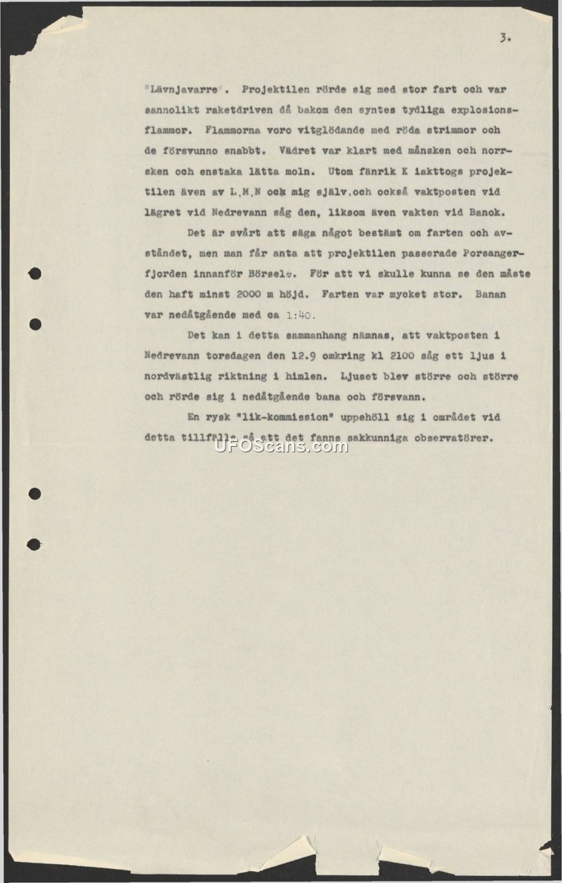 This document describes a sighting of a projectile at Lävnjavarre. The object was observed by an ensign (fänrik K), several other individuals (L, M, and N), and sentries at Nedrevann and Banok. The projectile was described as moving at a very high speed with a downward trajectory, likely rocket-driven, as evidenced by visible explosion flames that were white-glowing with red streaks. The weather conditions at the time were clear, with moonlight, northern lights, and some light clouds. The author estimates the object was at an altitude of at least 2000 meters. Additionally, the report notes that on Thursday, September 12, at approximately 2100 hours, a sentry at Nedrevann observed a light in the northwestern sky that grew in size and moved in a downward path before disappearing. The report mentions that a Russian 'corpse commission' was present in the area at the time, providing expert observers.