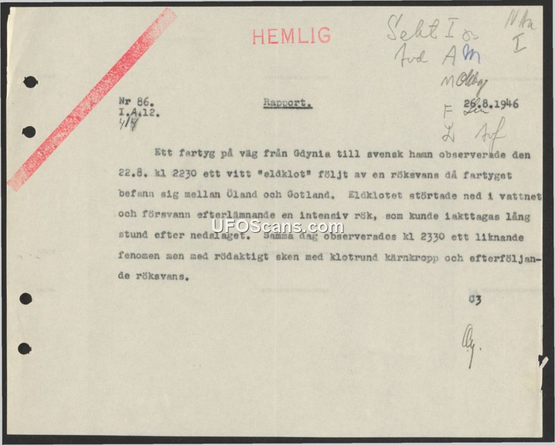 A report from August 1946 details two sightings of aerial phenomena observed by a ship between Öland and Gotland. The objects were described as fireballs with smoke trails, one of which appeared to crash into the sea.