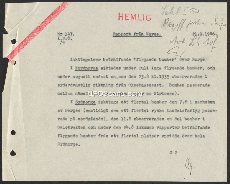 A 1946 Swedish intelligence report documenting sightings of 'flying bombs' over Northern and Southern Norway during July and August 1946.