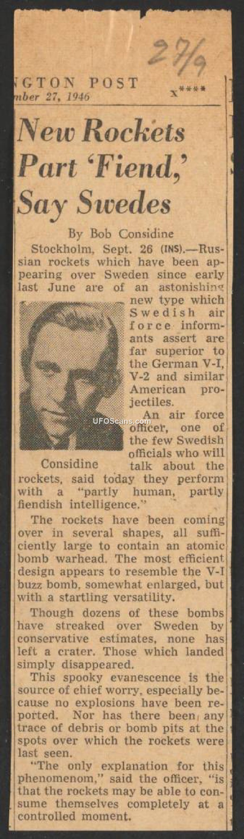 This article, published in the Washington Post on September 27, 1946, reports on the appearance of mysterious rockets over Sweden. According to an unnamed Swedish air force officer, these objects have been observed since June 1946 and are described as being technologically superior to German V-1 and V-2 rockets, as well as similar American projectiles. The rockets are reported to come in various shapes, with some resembling an enlarged V-1 buzz bomb, and are noted for their 'startling versatility' and 'partly human, partly fiendish intelligence.' A significant point of concern for Swedish authorities is the lack of physical evidence following these sightings. Despite dozens of reports of these objects streaking across the sky, there have been no craters, no debris, and no bomb pits found at the locations where they were last seen. The officer suggests that the only explanation for this 'spooky evanescence' is that the rockets possess the capability to consume themselves completely at a controlled moment.