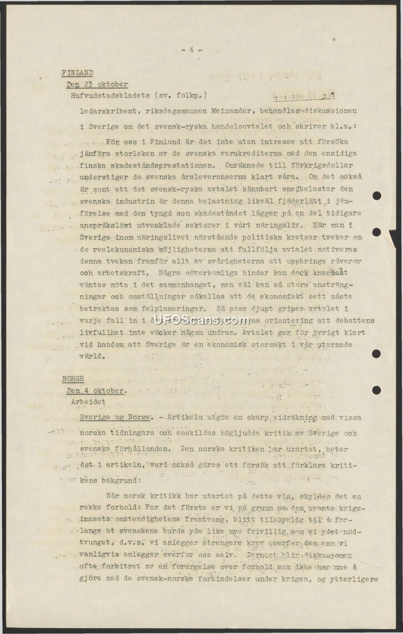 The document summarizes press commentary from Finland and Norway regarding Sweden's economic and political situation in the post-war period. The Finnish perspective, via Hufvudstadsbladet, discusses the impact of the Swedish-Russian trade agreement on Swedish industry. The Norwegian perspective, via Arbeidet, addresses criticism directed at Sweden regarding Swedish-Norwegian relations during the war.