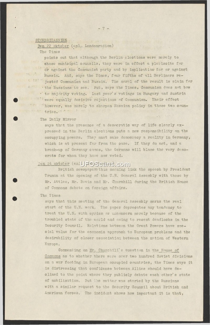 This document, marked as page 7 of a larger report, provides a summary of British press reactions to international political developments in October 1946. The first section, dated October 22, covers commentary from 'The Times' and 'The Daily Mirror' regarding the Berlin elections. 'The Times' interprets the election results as a significant rejection of Communism and Russia by the Berlin populace, though it notes that Communism does not adhere to majority voting. 'The Daily Mirror' emphasizes that the democratic expression in the Berlin elections places a new responsibility on the occupying powers to ensure democracy becomes a reality in Germany, warning that failure to do so could lead to the Germans blaming the very democratic systems they voted for. The second section, dated October 24, discusses British newspaper reactions to a speech by President Truman at the opening of the U.N. General Assembly, linking it to statements made by Mr. Attlee, Mr. Bevin, and Mr. Churchill in the House of Commons. 'The Times' argues that the General Assembly meeting marks the true beginning of U.N. work and urges against cynicism despite existing deadlocks in the Security Council. Furthermore, the paper addresses a question raised by Mr. Churchill in the House of Commons concerning the presence of over two hundred Soviet divisions in occupied European countries. 'The Times' expresses distress that confidence between the Allies has declined to the point of public debate regarding mobilization, while noting that the matter was initiated by the Russians requesting information about British and American forces.