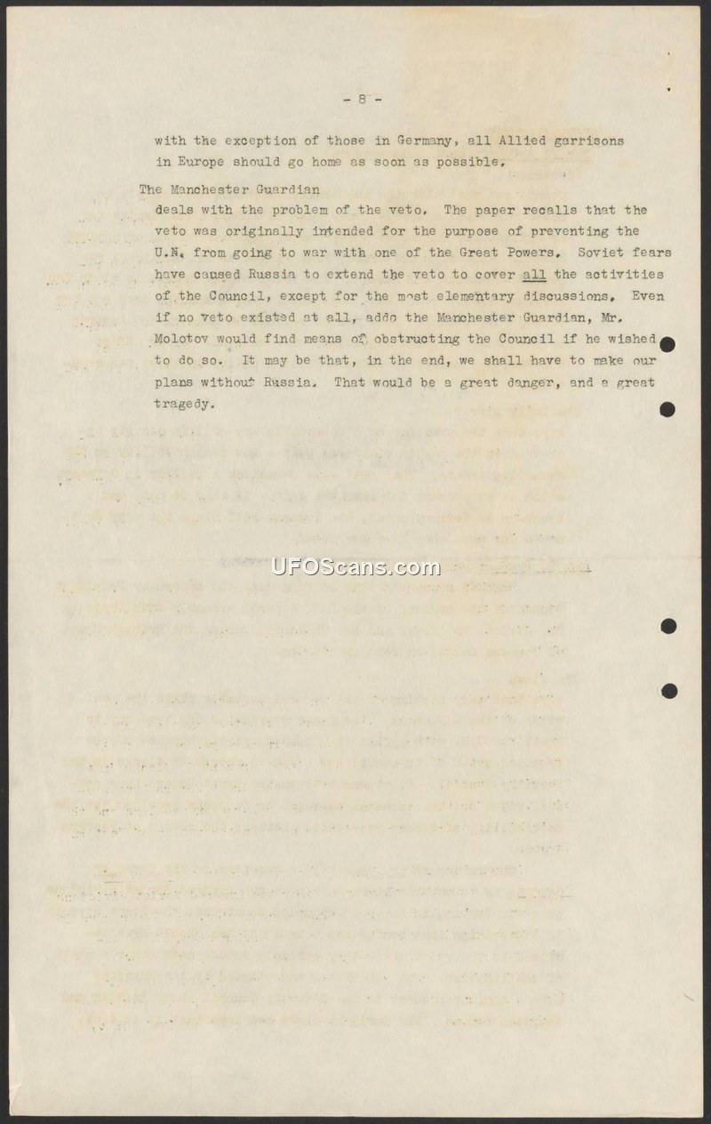 This document, identified as page 8 of a larger report, addresses two primary geopolitical concerns of the post-war era. First, it states that with the exception of those stationed in Germany, all Allied garrisons in Europe should return home as soon as possible. Second, it provides a summary of an article from the Manchester Guardian regarding the United Nations veto. The paper argues that the veto was originally intended to prevent the U.N. from going to war with a Great Power. However, it notes that Soviet fears have caused Russia to extend the use of the veto to cover nearly all activities of the Council, excluding only the most elementary discussions. The document concludes by suggesting that even without the veto, Mr. Molotov would likely find ways to obstruct the Council, and that the international community may eventually have to formulate plans without Russian participation, a prospect described as a great danger and a great tragedy.