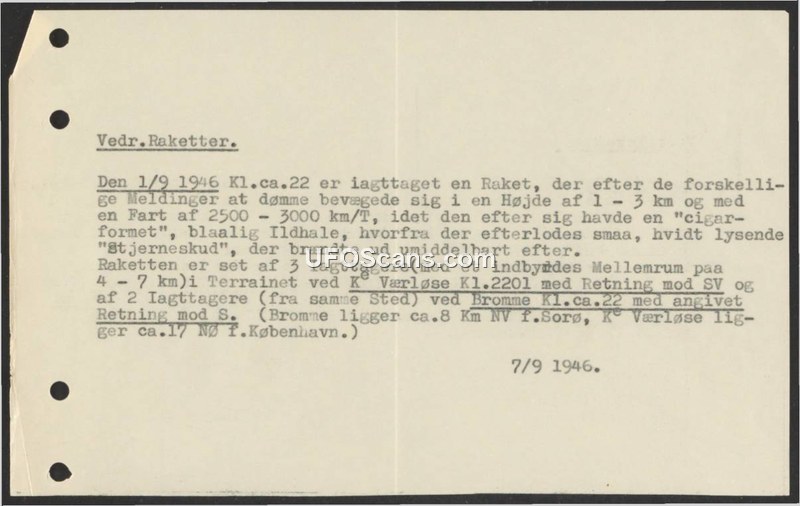 This document, dated September 7, 1946, reports on a sighting of a rocket-like object that occurred on September 1, 1946, at approximately 10:00 PM. According to various reports, the object was observed traveling at an altitude of 1 to 3 kilometers with a speed estimated between 2500 and 3000 km/h. The object was described as cigar-shaped with a bluish fire tail. It reportedly left behind small, white, glowing 'shooting stars' that extinguished shortly after appearing. The sighting was corroborated by three observers in the area of K Værløse, who noted the object moving toward the southwest, and two observers at Bromme, who noted the object moving toward the south. The document provides geographical context, noting that Bromme is approximately 8 kilometers northwest of Sorø, and K Værløse is approximately 17 kilometers northeast of Copenhagen.