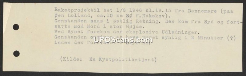 On August 1, 1946, at 19:15, a coastal police officer (Kystpolitibetjent) observed a rocket-like projectile (Raketprojektil) near Dannemare on the island of Lolland, Denmark, approximately 10 kilometers southeast of Nakskov. The object was seen moving in an easterly direction, having originated from the south and continuing toward the north at a high altitude. The witness reported that the object exhibited explosive discharges during the sighting. The object remained visible for approximately two minutes before it disappeared into the clouds.