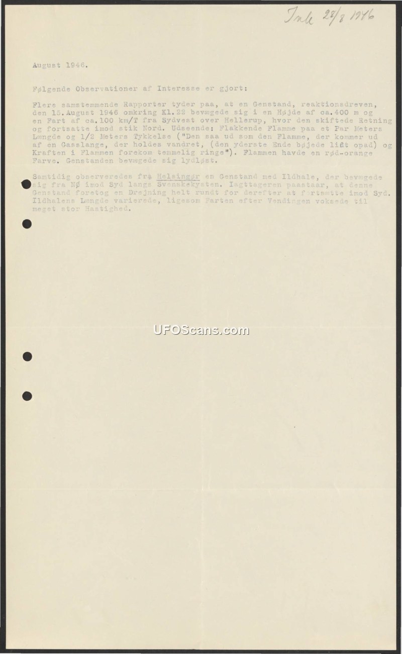 This document, dated August 1946, records two separate but concurrent observations of unidentified aerial phenomena in Denmark. The first report describes a reaction-driven object observed on August 15, 1946, at approximately 22:00. This object was flying at an altitude of roughly 400 meters at a speed of 100 km/h. It was initially traveling from the southwest over Hellerup before changing direction to head north. The object was described as having a flaming appearance, approximately a couple of meters long and half a meter thick, resembling a flame emerging from a horizontally held gas hose with the tip slightly bent upward. The flame was red-orange in color, and the object moved silently. Simultaneously, a second object was observed from Helsingør. This object was described as having a 'fire tail' and was moving from the northeast along the Swedish coast. This object performed a complete turn before continuing in a southerly direction. The length of the fire tail varied, and the speed of the object increased significantly after the turn.