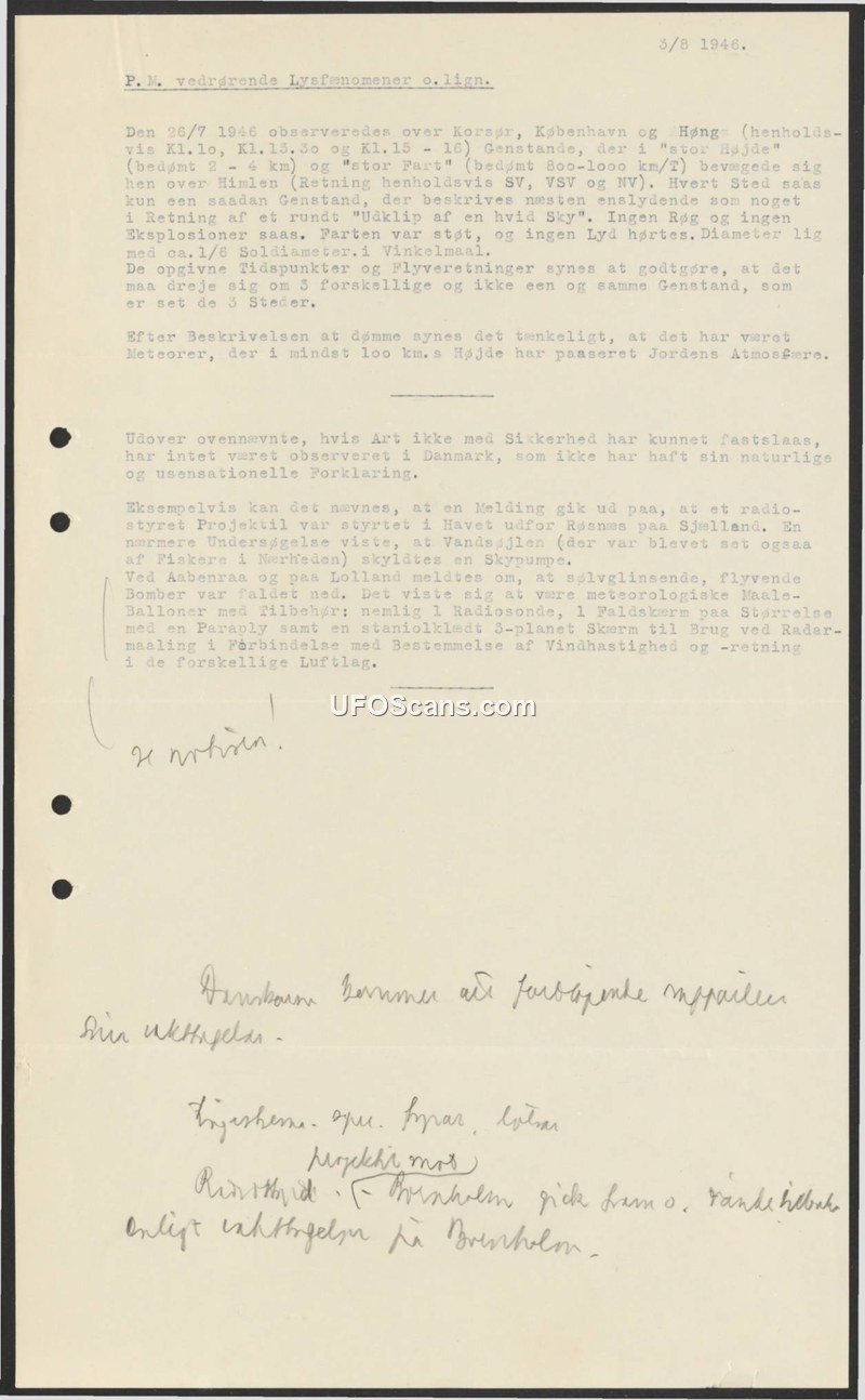 A 1946 Danish aviation report analyzes sightings of aerial objects, concluding they were likely meteors, while dismissing other reports as meteorological balloons or natural weather phenomena.