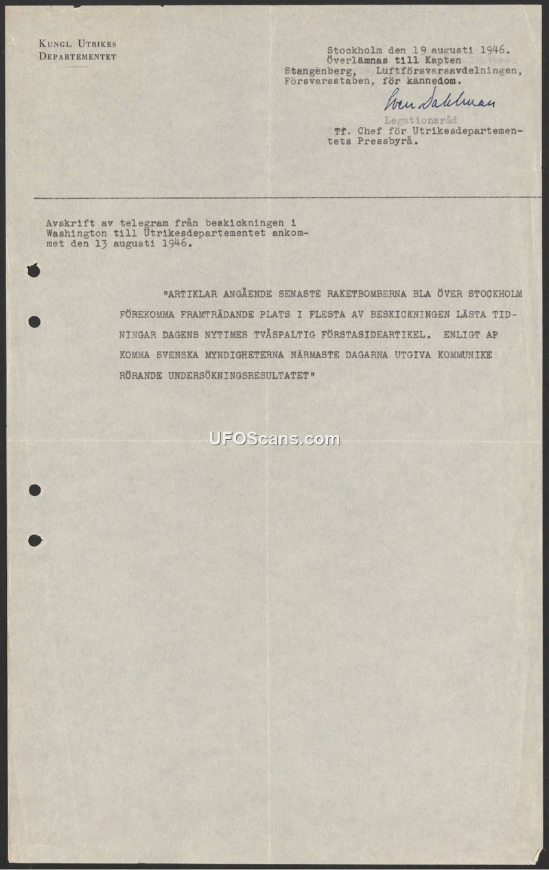 This document is a memorandum issued by the Swedish Ministry for Foreign Affairs (Kungl. Utrikesdepartementet) on August 19, 1946. It is addressed to Captain Stangenberg of the Air Defense Department (Luftförsvarsavdelningen) at the Defense Staff (Försvarsstaben) for his information. The document provides a transcript of a telegram received on August 13, 1946, from the Swedish legation in Washington. The telegram reports that articles concerning recent 'rocket bombs,' specifically mentioning those observed over Stockholm, are receiving prominent coverage in the newspapers read by the legation staff. It highlights a two-column article on the front page of the New York Times as an example of this coverage. Furthermore, the telegram conveys information from the Associated Press stating that Swedish authorities were expected to release a communiqué regarding the results of their investigation into these events within the following few days.