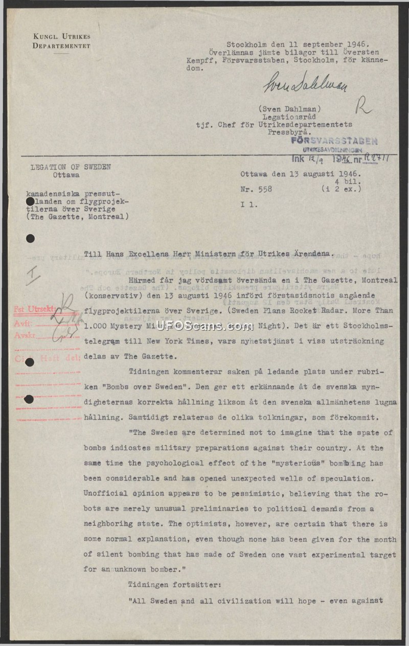 This document is a report from the Swedish Legation in Ottawa to the Ministry for Foreign Affairs in Stockholm, dated August 13, 1946. It serves to transmit a front-page article from the Montreal newspaper 'The Gazette' regarding the ongoing reports of 'mystery missiles' over Sweden. The author, Sven Dahlman, notes that the article is based on a Stockholm telegram sent to the New York Times. The report highlights that the Swedish authorities and the public are being praised for their calm and correct handling of the situation. The document summarizes the content of the press coverage, which describes the psychological impact of the 'mysterious bombing' and the resulting speculation. The press reports that while some observers are pessimistic, fearing the 'robots' are a prelude to political demands from a neighboring state, others remain optimistic that a normal explanation will eventually be found for the month of silent bombing that has turned Sweden into an experimental target.