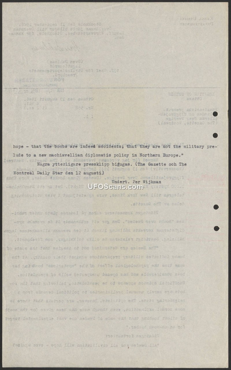 This document is a brief piece of correspondence signed by Per Wijkman. It references the inclusion of additional press clippings from 'The Gazette' and 'The Montreal Daily Star' dated August 12th. The text expresses a hope that certain 'bombs' are merely accidents and not a military prelude to a new Machiavellian diplomatic policy in Northern Europe.