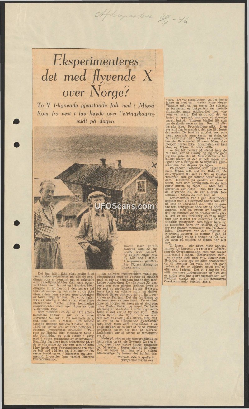 This newspaper article reports on the sighting of two unidentified objects, referred to as 'flying X's', which occurred on a Thursday between 12:00 and 12:30. The objects were observed flying at low altitude from the west over the Feiring forests before crashing into Lake Mjøsa. Witnesses, including farmer Sigvart Skaug and his family, described the objects as cigar-shaped, approximately 2.5 meters long, with 1-meter wings that appeared to flap like cloth. The objects were described as having a metallic glistening appearance with a black midsection. Witnesses reported a strong rushing sound rather than an engine noise, and the air pressure was strong enough to cause tree tops to sway and force observers to the ground. The acting lensmann for Feiring and Hurdal collected witness statements and notified the Army High Command. Captain Jørstad of the Air Force High Command reviewed the reports and noted that the description closely resembles the V-1 rocket. He suggested that if the objects were indeed similar to the V-1, they might have been launched from aircraft or ships. The article concludes by noting that further investigations were planned and that the public should report any additional observations to the Air Force High Command.