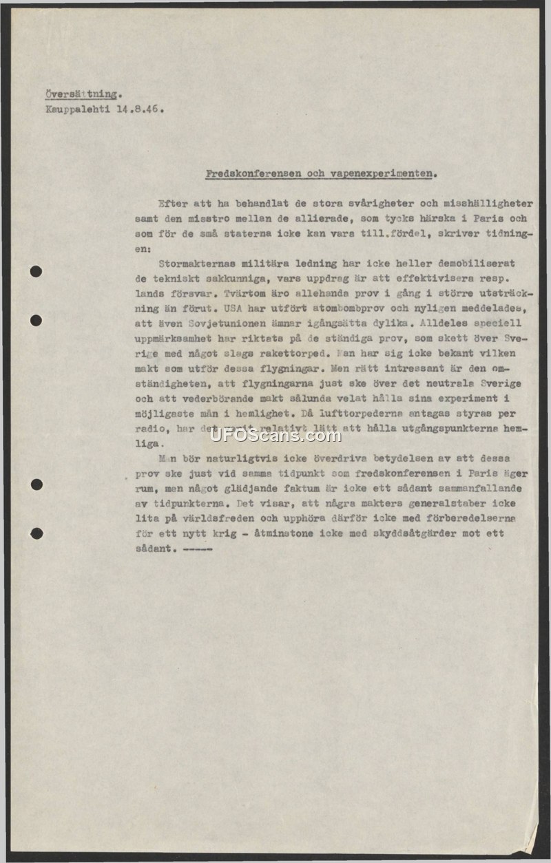 This document, a translation of a press clipping from the Finnish newspaper Kauppalehti dated August 14, 1946, provides a contemporary perspective on the international political climate and military activities following the Second World War. The text highlights the atmosphere of distrust among the Allied powers during the Paris Peace Conference. It reports that despite the end of the war, major powers have not demobilized their technical experts, but rather have intensified military testing. The author specifically points to persistent reports of unidentified aerial flights occurring over neutral Sweden, involving objects described as 'rocket torpedoes' or 'air torpedoes.' While the origin of these flights remains unknown to the public, the author notes that the use of radio control for these 'air torpedoes' would have made it relatively easy for the responsible power to keep their launch sites secret. The document concludes by observing that the timing of these experiments, coinciding with the Paris Peace Conference, suggests that the general staffs of certain powers do not trust in the stability of world peace and are continuing to prepare for future conflicts, or at the very least, are prioritizing defensive measures against such possibilities.