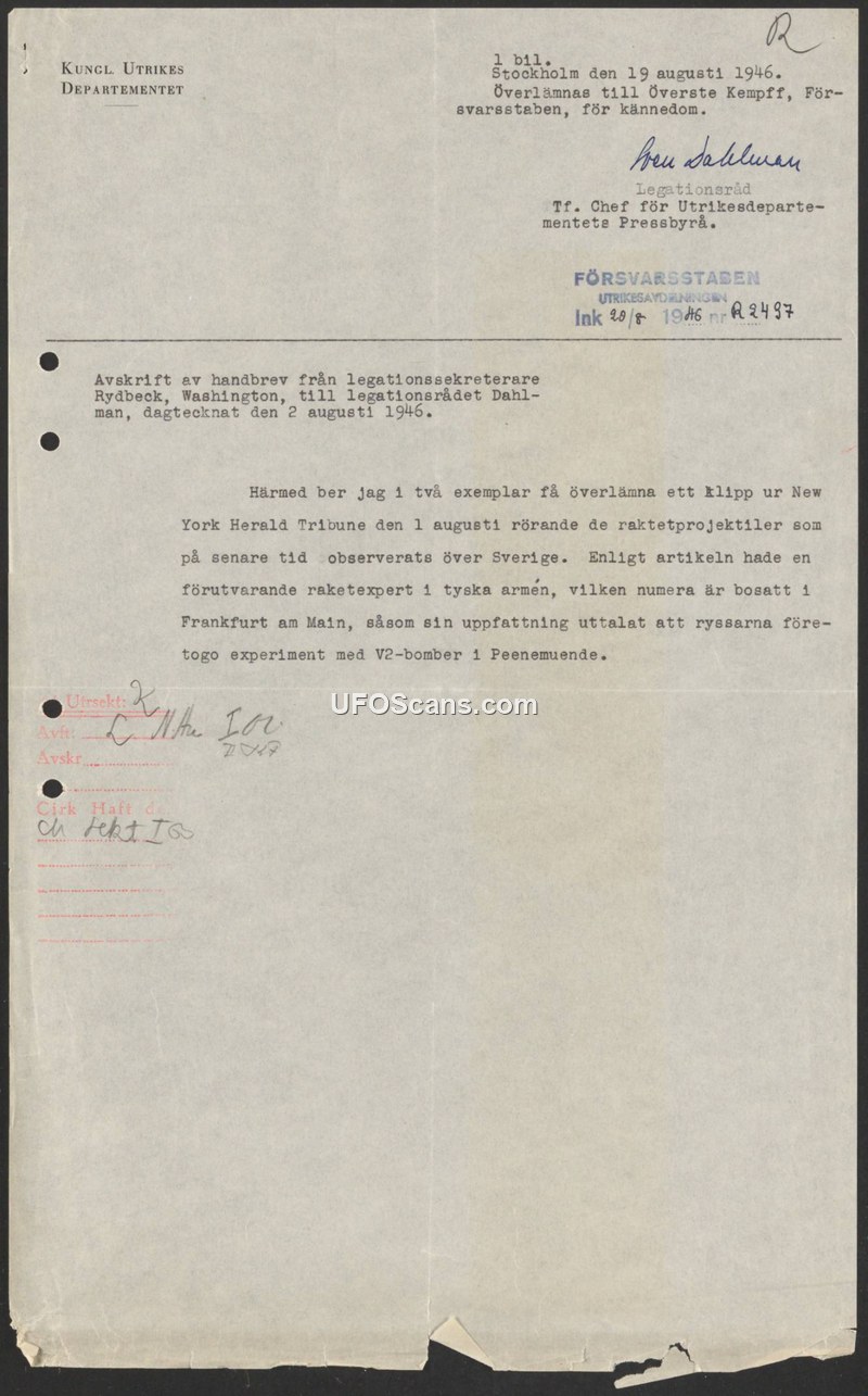 This document is a formal communication from the Swedish Ministry for Foreign Affairs (Kungl. Utrikesdepartementet), dated August 19, 1946. It is addressed to Colonel Kempff of the Swedish Defence Staff (Försvarsstaben) for his information. The document serves as a cover letter for an enclosure: a newspaper clipping from the New York Herald Tribune, dated August 1, 1946. The content of the clipping concerns reports of rocket projectiles that had been observed over Sweden during that period. According to the article, a former rocket expert from the German army, now living in Frankfurt am Main, expressed the opinion that the Soviet Union was conducting experiments with V2 rockets at Peenemünde. The document itself is a transcript of a letter originally written by Legation Secretary Rydbeck in Washington to Legation Councilor Dahlman on August 2, 1946.