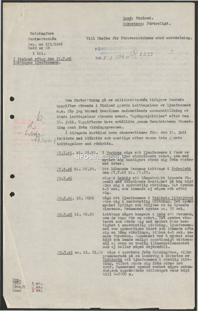 A 1946 Finnish military intelligence report documenting multiple sightings of 'ghost projectiles' and luminous aerial phenomena across Finland in late July 1946.