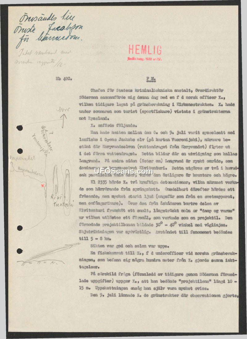 This document is a memorandum (PM) regarding an incident reported by a former Norwegian officer, referred to as 'X', who had been working as a tourist and fisherman in the border regions near Russia during the summer of 1938. On the night between July 8 and July 9, 1938, at 23:35, X was fishing in the Grens Jaakobs elv (Vuoremi joki) near the Kivitunturi mountain range. X reported hearing two powerful detonations, which he described as sounding like explosions. Immediately following these sounds, he heard a hissing, very strong noise, which he compared to a welding apparatus but noted was louder. A narrow, elongated cloud of 'steam and heat' appeared over the part of Kivitunturi furthest from the observer. From this cloud, an object emerged that appeared to be a projectile. The object's trajectory was at a 30-40 degree angle to the horizon, and the distance to the phenomenon was estimated to be 5-8 kilometers. The weather was clear and the sun was up. A fishing companion of X, a former non-commissioned officer in the Norwegian border guard who was located a few hundred meters away, made the same observations. When asked specifically about the size of the object, X estimated it to be 10-15 meters, though he emphasized that this estimate was highly uncertain. X left the border area on July 9.