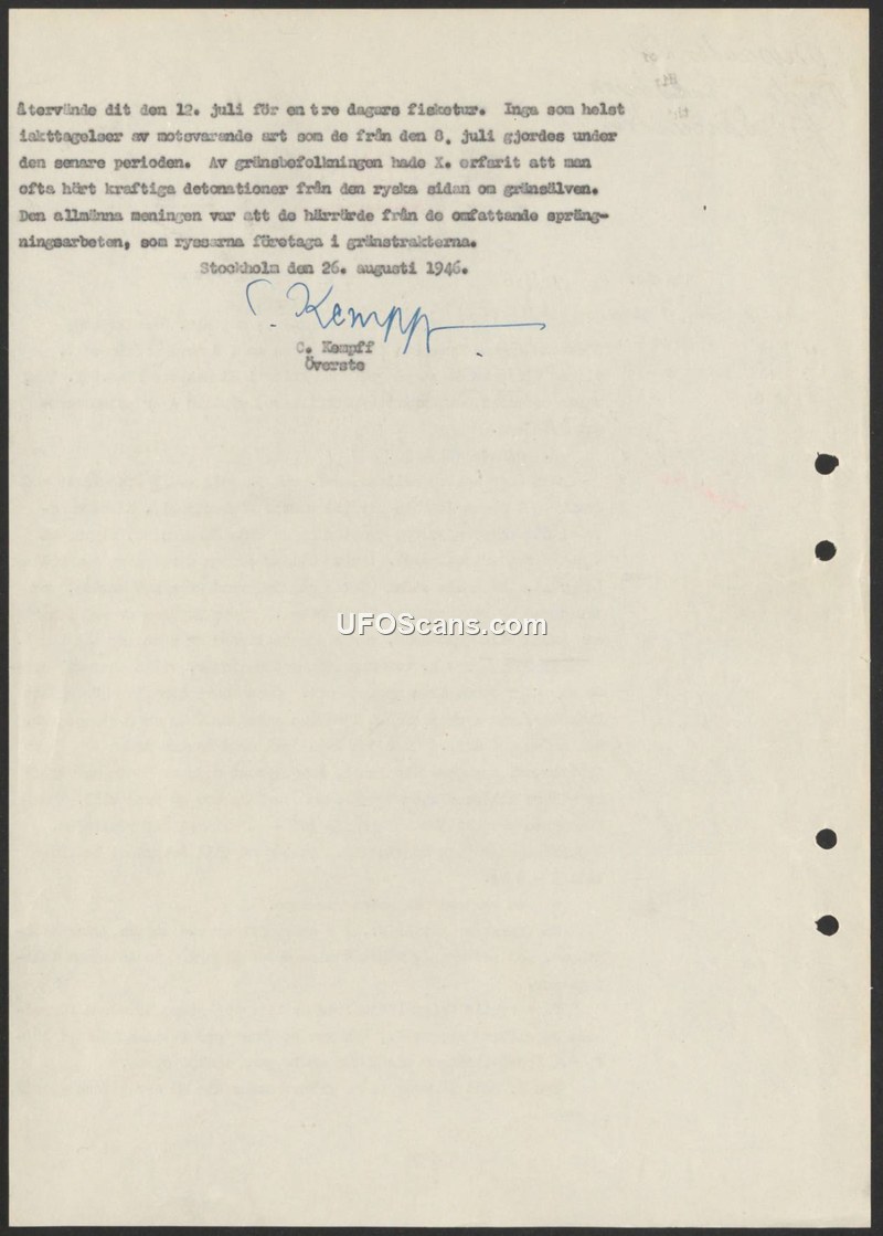 A report by Colonel C. Kempff dated August 26, 1946, states that no unusual observations were made during a mid-July visit to the border. Local reports of detonations were attributed to Russian blasting work.
