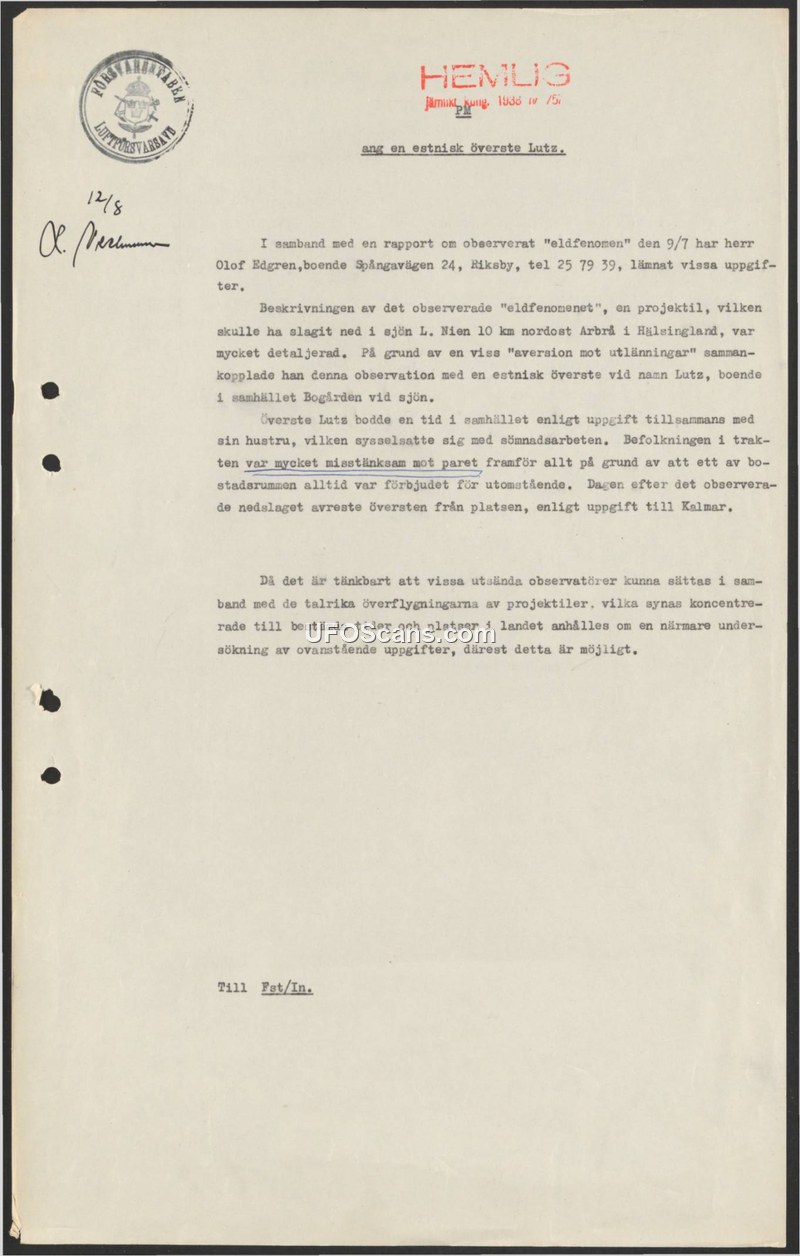 This document, issued by the Swedish Defense Staff (Försvarsstaben) in 1938, concerns a report of an 'observed fire phenomenon' that occurred on July 9th. A witness, Olof Edgren, provided detailed information regarding a projectile that allegedly crashed into Lake L. Nien, located 10 kilometers northeast of Arbrå in the province of Hälsingland. Edgren, expressing a personal aversion toward foreigners, suggested a connection between this event and an Estonian colonel named Lutz, who resided in the community of Bogården near the lake. According to the report, Colonel Lutz lived with his wife, who worked as a seamstress. The local population was suspicious of the couple, primarily because one of the rooms in their residence was strictly off-limits to outsiders. The colonel reportedly departed the area for Kalmar the day after the incident. The document notes that because it is plausible that certain foreign observers might be linked to the frequent overflights of projectiles observed at specific times and locations across the country, a closer investigation of these details is requested, provided it is feasible.