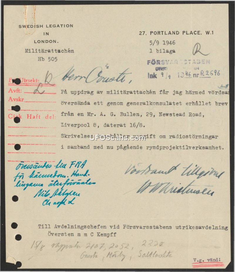 A 1946 Swedish Legation document forwarding a report from a British citizen regarding radio interference linked to rocket activity. It highlights early concerns about aerial phenomena and radio disturbances.