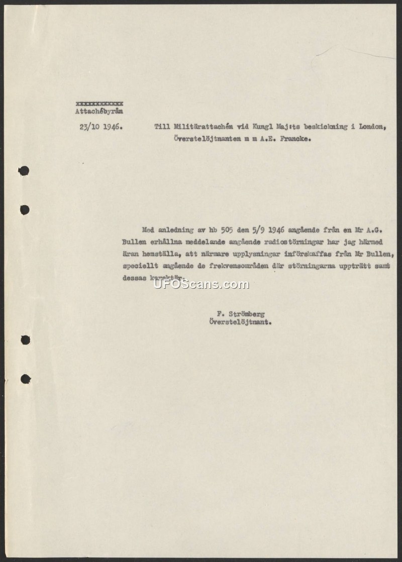 This document is a formal communication dated October 23, 1946, issued by the Attachébyrån (Attaché Office). It is addressed to the Military Attaché at the Royal Swedish Legation in London, Lieutenant Colonel A.E. Francke. The correspondence references a previous communication, identified as 'hb 505' and dated September 5, 1946, concerning reports of radio interference provided by a Mr. A.G. Bullen. The author, Lieutenant Colonel F. Strömberg, requests that the Military Attaché seek additional, more detailed information from Mr. Bullen. Specifically, the request asks for clarification regarding the frequency ranges in which the interference occurred and the nature or characteristics of the interference itself.