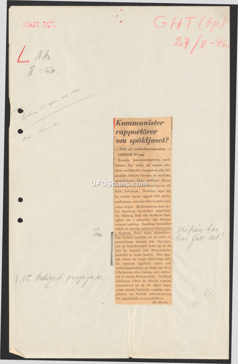 A 1946 newspaper report alleges that Swedish Communist Party members were ordered to track mysterious projectiles. It also claims Soviet rocket bases were established in the Baltic and Karelia regions.