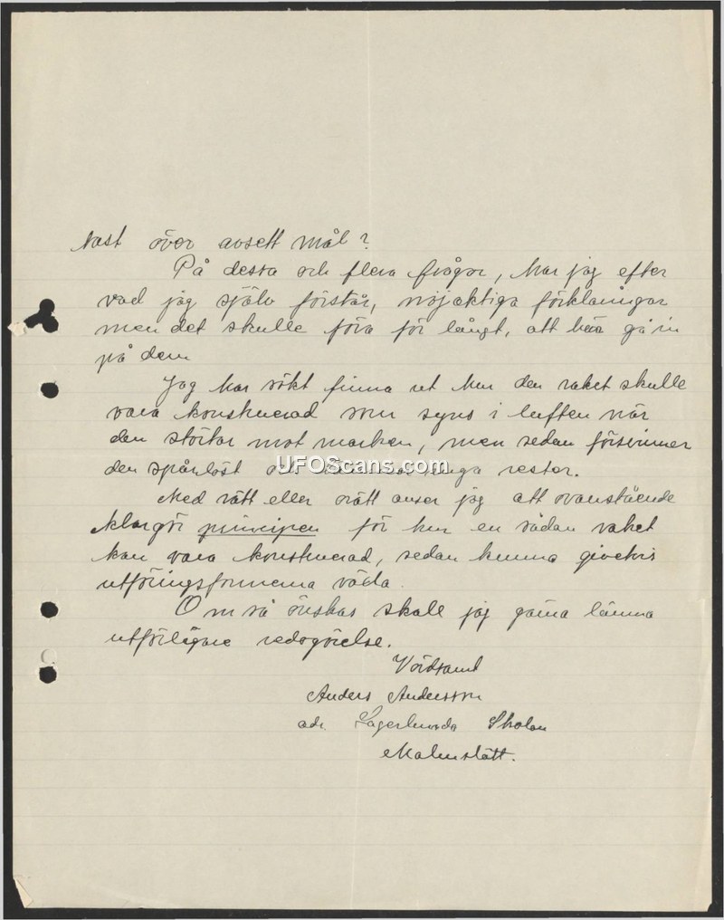 This document is a handwritten letter from Anders Andersson, based at Lagerlunda Skolan in Malmslätt, Sweden. The author addresses questions regarding the nature of a specific type of rocket. Andersson states that he has attempted to determine how a rocket could be constructed such that it is visible in the air when near the ground, but subsequently disappears without a trace, leaving no remnants behind. He expresses that he believes he has clarified the principles of how such a rocket could be constructed and offers to provide a more detailed account if it is desired.