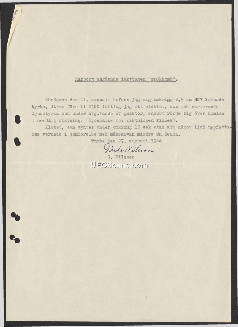 A report by G. Nilsson detailing the sighting of a fireball (ghost bomb) near Sorunda, Sweden, on August 11, 1946. The object moved rapidly north for 15 seconds without making any sound.