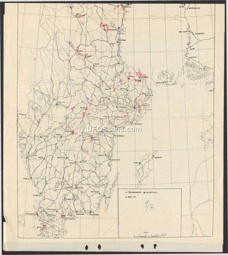 This document is a map of Sweden featuring numerous handwritten annotations, including red and blue arrows indicating various flight paths or movement vectors across the country. The map includes a date notation of '9/7' in the lower right corner. There are handwritten notes in the upper right corner referencing 'Riktning' (Direction) with a speed of '400 m/sek' and an altitude of '350 m'. The map identifies various Swedish cities and locations such as Stockholm, Uppsala, Göteborg, Malmö, and others. The legend indicates symbols for 'FÖRLÄGGNINGSORT' (Location of deployment/garrison) and 'MILBEFSTAB' (Military command staff). The document appears to be a military or intelligence-related plotting map used to track aerial movements or military deployments.