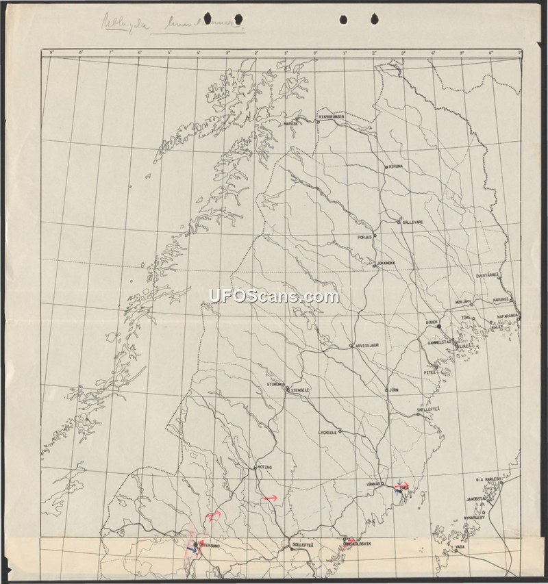 The document is a printed geographic map of Northern Sweden, featuring various towns and cities such as Kiruna, Gallivare, Boden, Lulea, and Ostersund. The map contains handwritten annotations, including a header that appears to be in Swedish, and several red and blue ink markings, including arrows pointing toward specific locations, notably near Ostersund and Umea. No further textual context, dates, or official agency markings are present on the document to explain the purpose of these annotations.