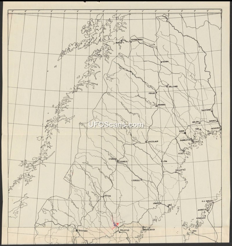 This document is a geographic map of Northern Sweden containing a handwritten annotation '14-15' and a red arrow pointing to a specific region.