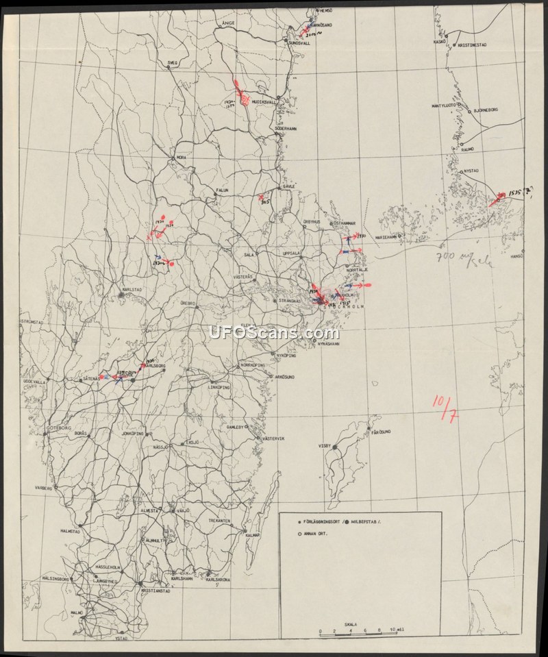 This document is a map of Sweden featuring various handwritten annotations, including times and red markings indicating specific locations. The map includes a legend for 'FÖRLÄGGNINGSORT' (garrison location) and 'MILBEFSTAB' (military command staff), as well as 'ANNAN ORT' (other location). The date '10/7' is written in red ink on the lower right side of the map. Various times are noted across the map, such as 1430, 1535, 1930, and 1915, often associated with red arrows or markings. The map provides a visual representation of geographic points across Sweden, though it lacks accompanying text to explain the specific nature of the events or observations recorded.