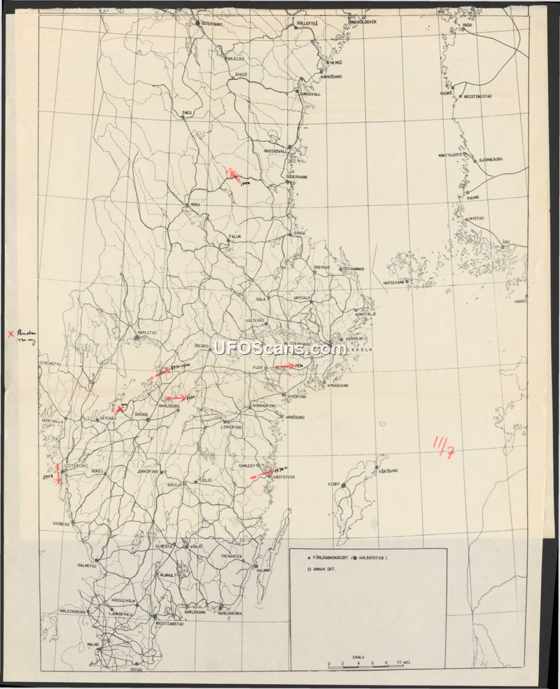 A map of Sweden annotated with handwritten times and locations, suggesting a series of aerial incidents. The markings indicate activity occurring at various points across the country.