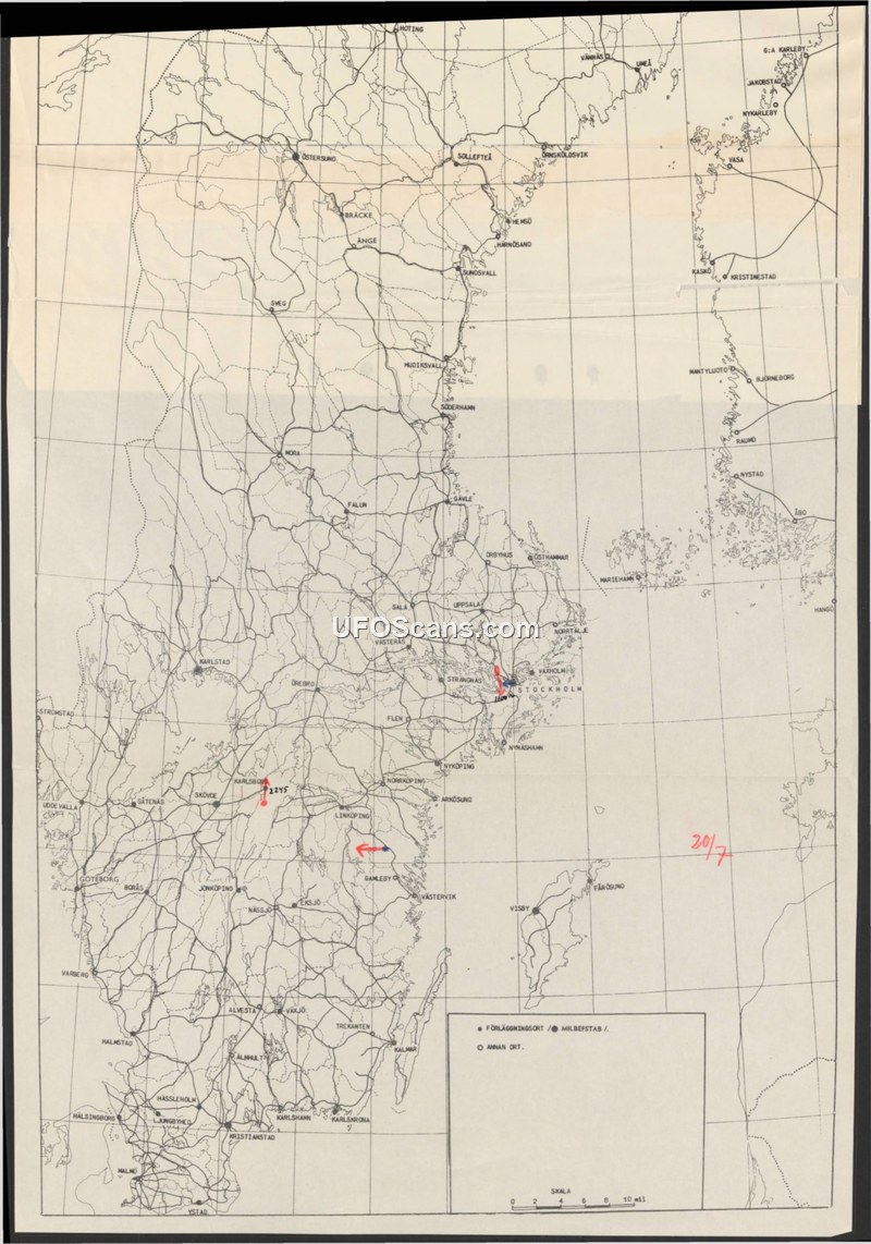 This is a map of Sweden annotated with red ink markings, including a date (20/7) and a time (2245), indicating specific locations of interest.