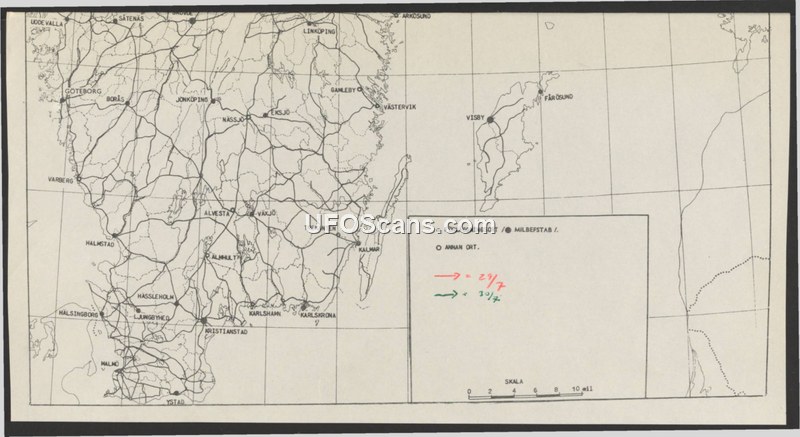 A map of Sweden marking military and other locations with handwritten annotations indicating dates of 29/7 and 30/7.