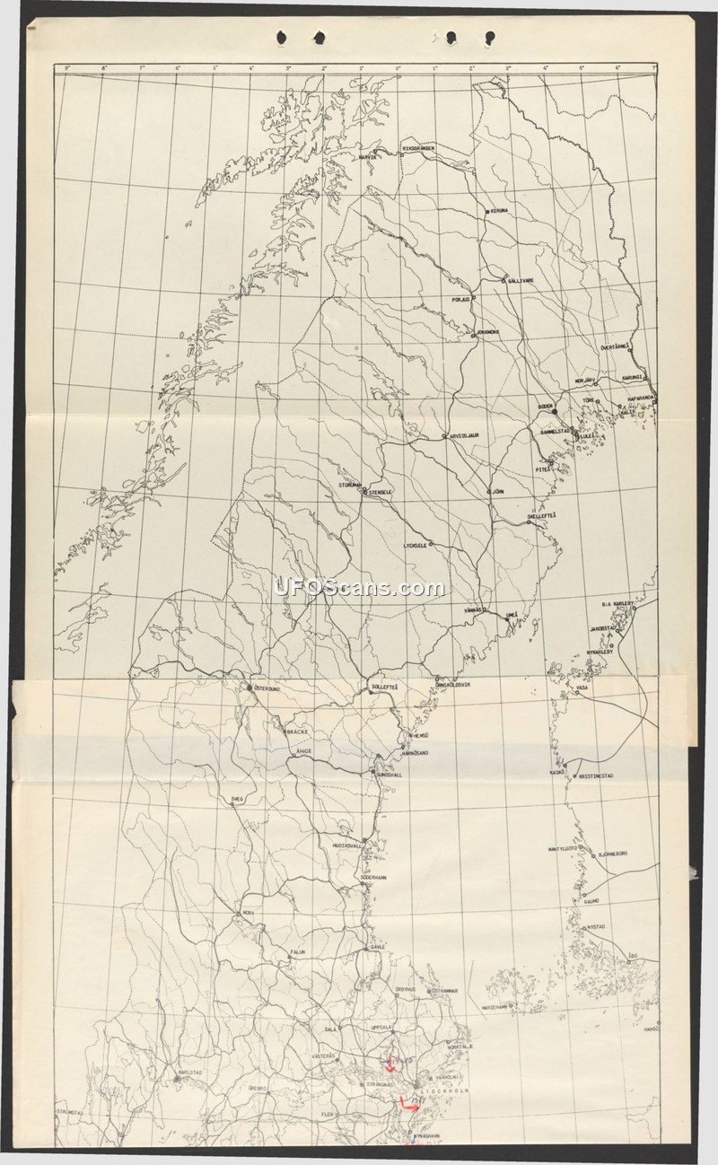 The document is a cartographic representation of Sweden, detailing various cities, towns, and geographic features. The map includes a grid system and labels for numerous locations such as Kiruna, Gallivare, Boden, Lulea, Umea, Ostersund, Sundsvall, Gavle, Uppsala, and Stockholm. There are two red arrows drawn on the map near the southern region, specifically pointing toward the area of Stockholm and Nynashamn. The map provides a comprehensive overview of the Swedish rail and road network infrastructure as it existed at the time of the document's creation.