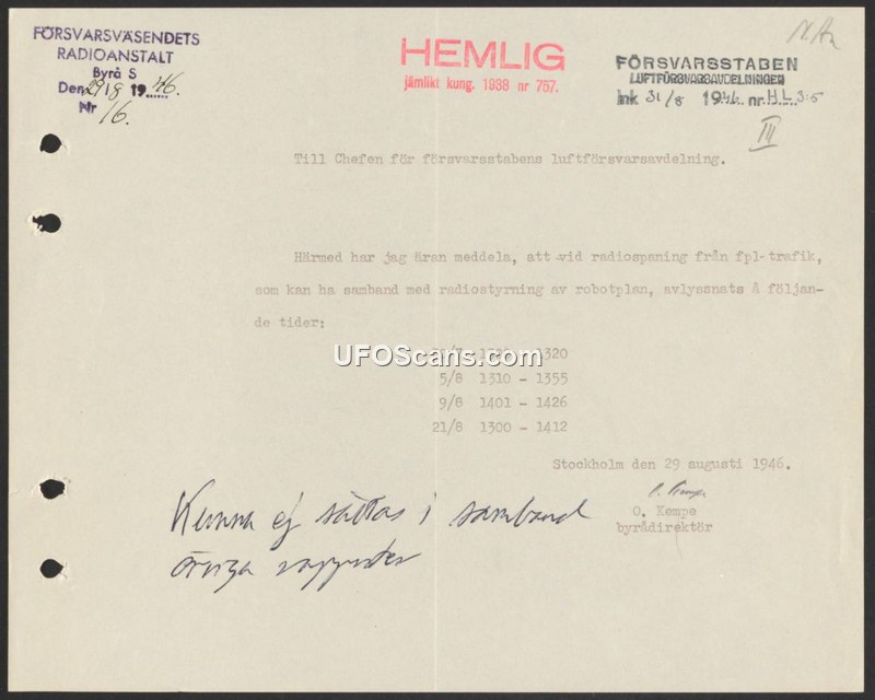 A 1946 Swedish military document logs radio intercepts of potential 'robot plane' control signals. A handwritten note indicates these intercepts could not be correlated with other existing reports.