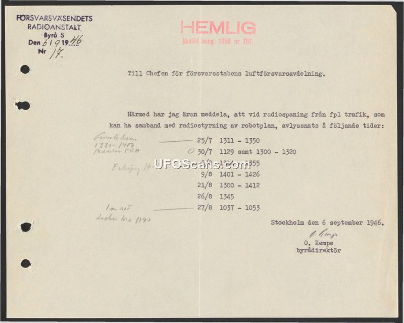 A 1946 Swedish military document reports on radio monitoring of aircraft traffic suspected of being linked to the remote control of robot planes. It provides a list of specific dates and times of these interceptions.