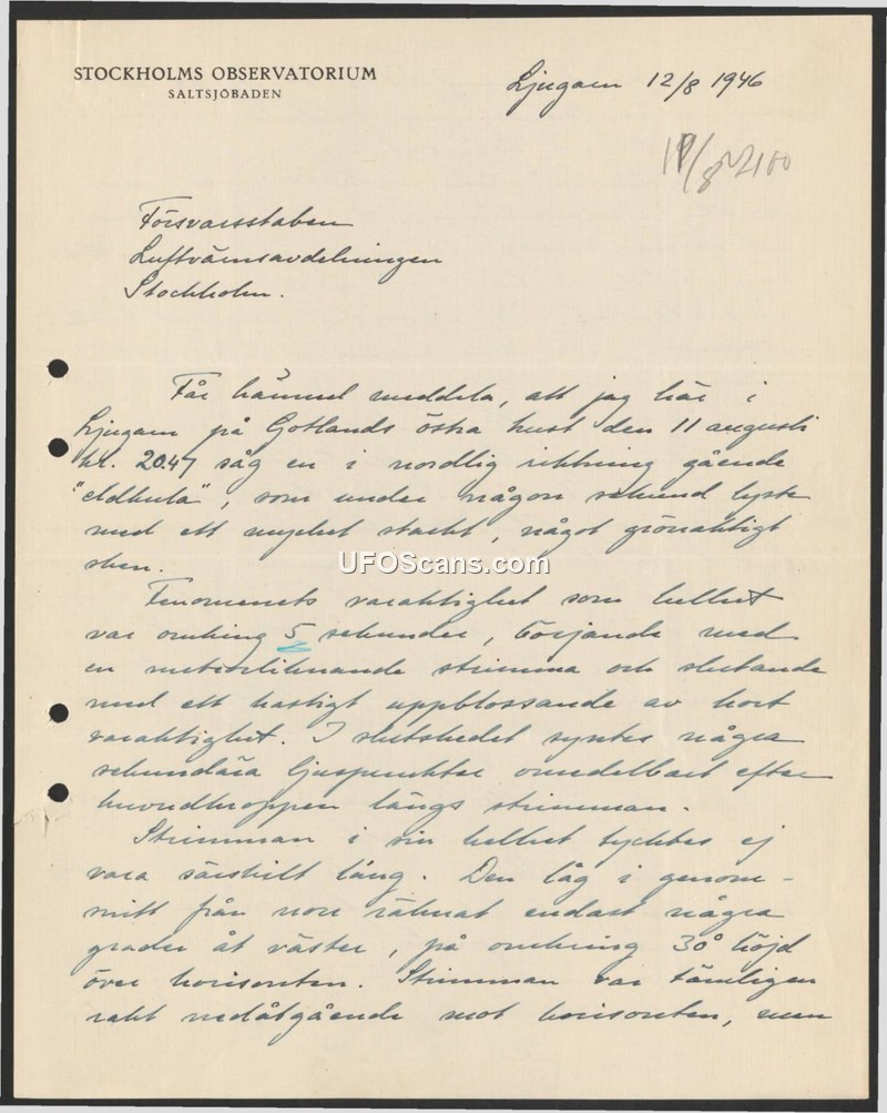 A report from the Stockholm Observatory detailing a fireball sighting over Ljugarn, Gotland, on August 11, 1946. The object was described as greenish, moving north, and lasting five seconds.