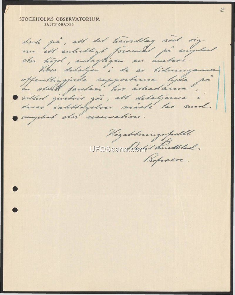 This document is a brief piece of correspondence from the Stockholm Observatory in Saltsjöbaden, signed by Professor Bertil Lindblad. The author provides an assessment of an aerial object, concluding that it was likely a meteor observed at a very high altitude. Professor Lindblad explicitly warns against relying on the details provided in newspaper reports regarding the incident. He argues that such reports are prone to being influenced by the vivid imaginations of the witnesses, and therefore, the details contained within those public accounts must be treated with significant reservation.