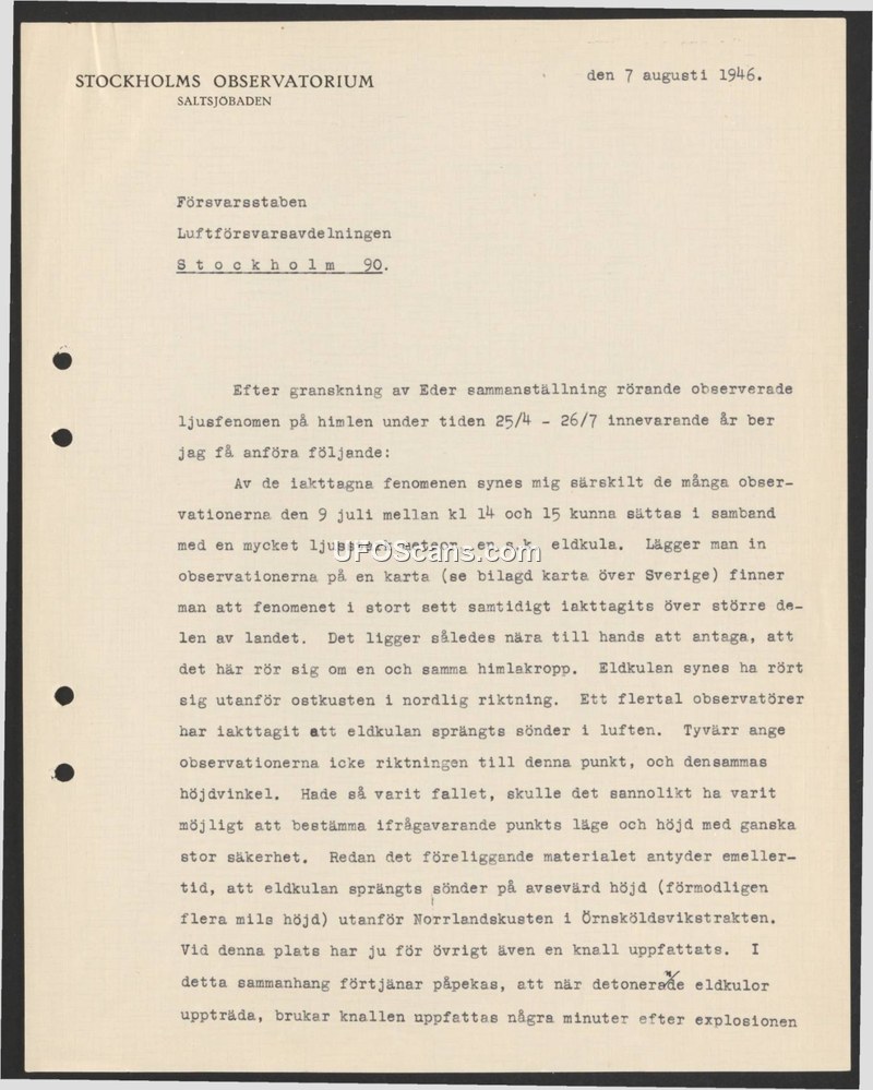 This document is a letter dated August 7, 1946, from the Stockholm Observatory to the Air Defense Department of the Swedish Defense Staff. The letter serves as a response to a request for analysis regarding light phenomena observed in the sky between April 25 and July 26, 1946. The author focuses specifically on a series of observations made on July 9, 1946, between 14:00 and 15:00. By plotting these observations on an enclosed map of Sweden, the author concludes that the reports likely describe a single celestial body—a very bright meteor, or 'fireball'—that traveled in a northerly direction outside the Swedish east coast. Many observers reported that the object exploded in the air. The author expresses regret that the observations did not include the direction or elevation angle to the point of the explosion, which would have allowed for a more precise determination of its location and altitude. However, based on the available material, the author estimates that the fireball detonated at a significant altitude, likely several miles high, in the vicinity of Örnsköldsvik. The report notes that a 'bang' was heard in that area, and the author adds a technical observation that when detonating fireballs occur, the sound is typically perceived several minutes after the visual explosion.