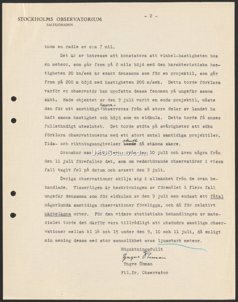 This document, issued by the Stockholm Observatory in Saltsjöbaden, provides an analytical assessment of reported aerial phenomena observed between July 9 and July 11. The author, Yngve Öhman, addresses the difficulty of reconciling multiple reports of a single object. He explains that the angular velocity of a meteor at an altitude of 2 miles traveling at 20 km/sec is identical to that of a projectile at 200 meters altitude traveling at 200 m/sec, which explains why observers might perceive these phenomena in a similar manner. Öhman argues that it is impossible for a single projectile to have been observed from such a large portion of the country while maintaining the same speed and height as a fireball. He further notes that attempts to explain the observations as a large number of simultaneous projectiles are problematic due to inconsistencies in time and direction. Regarding reports from July 10 and 11, the author suggests that some observers may have misidentified the date and were actually referring to the July 9 event. He concludes that other observations differ from the primary case, though some share similar descriptions. Ultimately, he recommends that for future statistical treatment of the material, all observations made between 14:00 and 15:00 on July 9, 10, and 11 should be excluded, as he believes they are highly likely to be bright meteors.