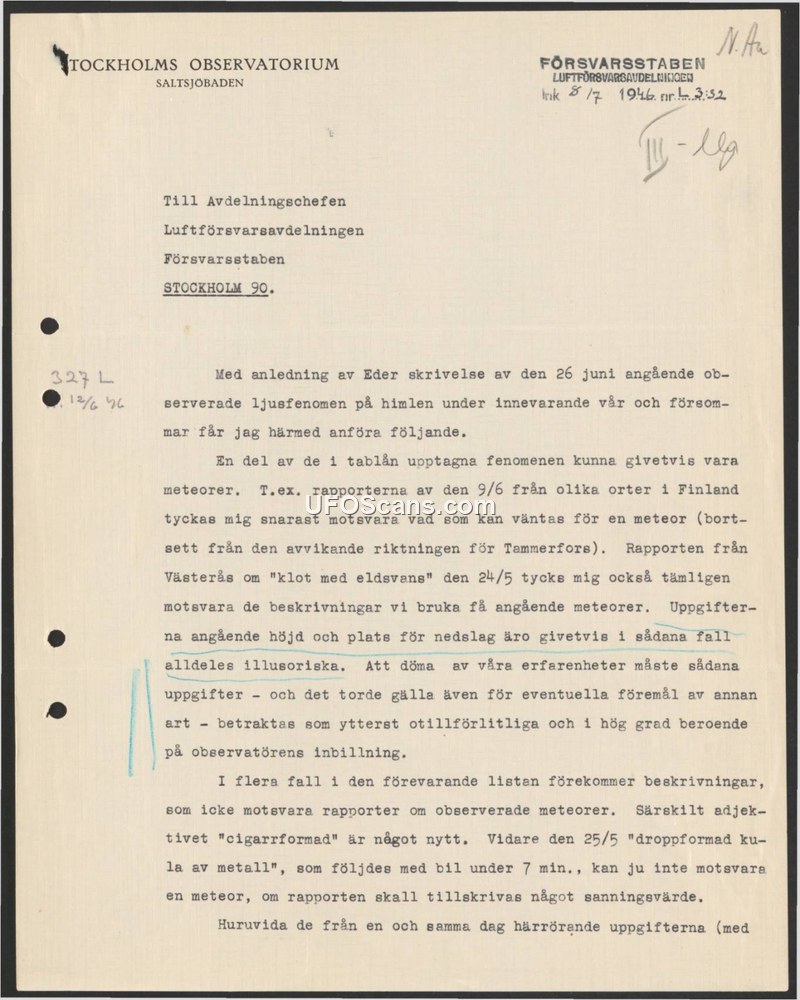 A 1946 letter from the Stockholm Observatory to the Swedish Defense Staff evaluating reports of aerial light phenomena. The author concludes that while some sightings are likely meteors, others, such as cigar-shaped objects, remain unexplained and potentially anomalous.
